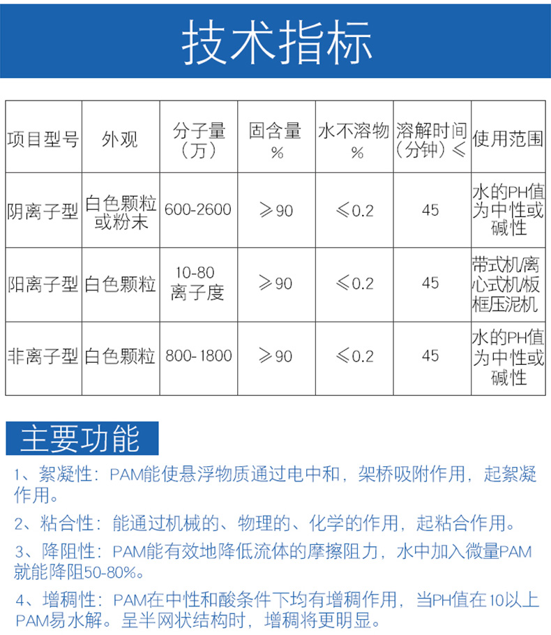聚丙酰胺乳液除了具備固體聚丙烯酰胺絮凝劑的優點之外還具有電荷密度可選性大,溶解速度快,能耗低,存放和使用方便等特點。與傳統陽離子聚丙烯酰胺產品相比,聚丙烯酰胺的乳液適用的PH值范圍更廣,電荷穩定性更高,絮凝效果更好,用藥量更少等一系列優點。